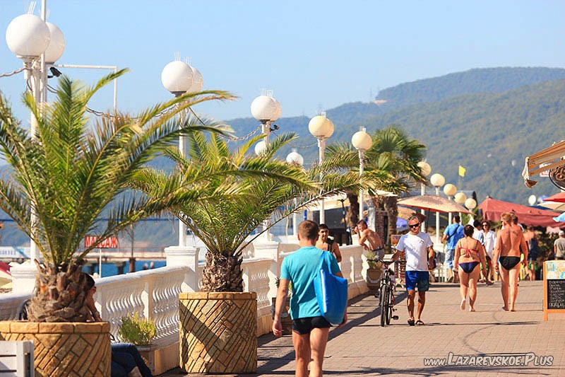 С другой стороны, между улочками, ведущими в центр Лазаревского, расположились множество гостиниц, небольших магазинов и увеселительных заведений. В южной части набережная граничит с городским парком.