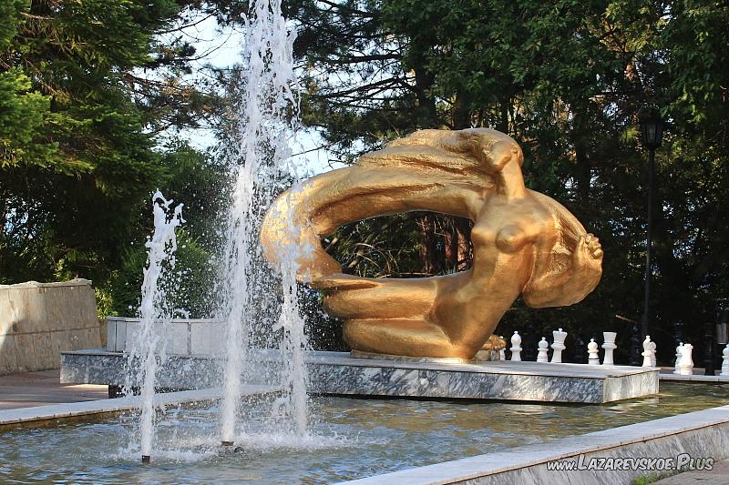 Длинный прямоугольный трёхструйный фонтан, на дальнем крае которого разместилась скульптура девушки с распущенными волосами.