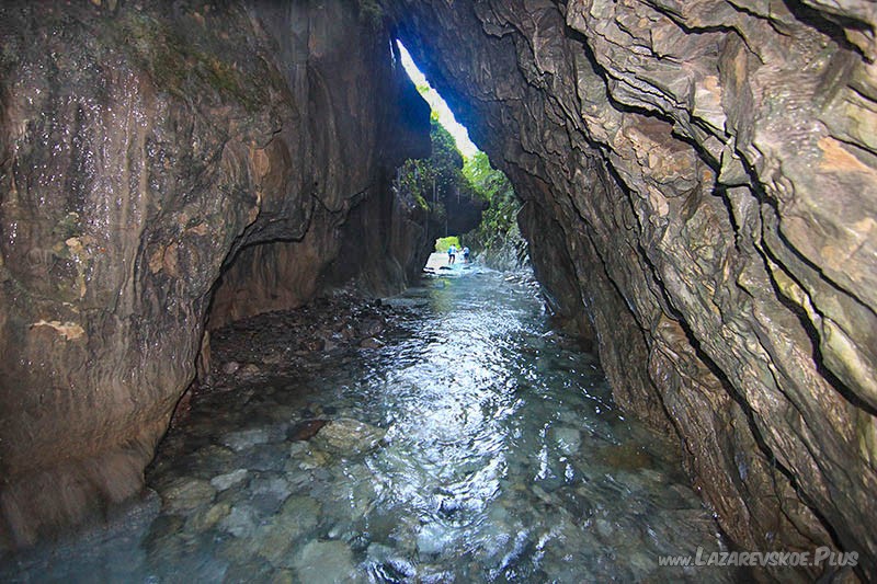 По стенам и с потолка грота стекают струйки воды, падая в текущую по дну речку. Высота грота около трёх метров, длинна около двадцати.
