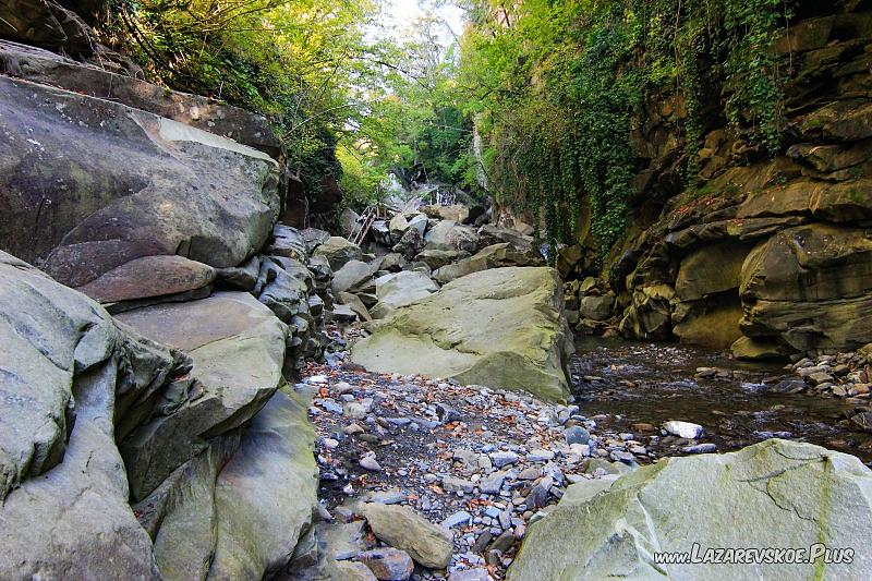 Валуны, перегородив русло реки и изменив её обычное течение, заставили её извиваться между камнями, создавая множество небольших водопадиков и водоскатов.
