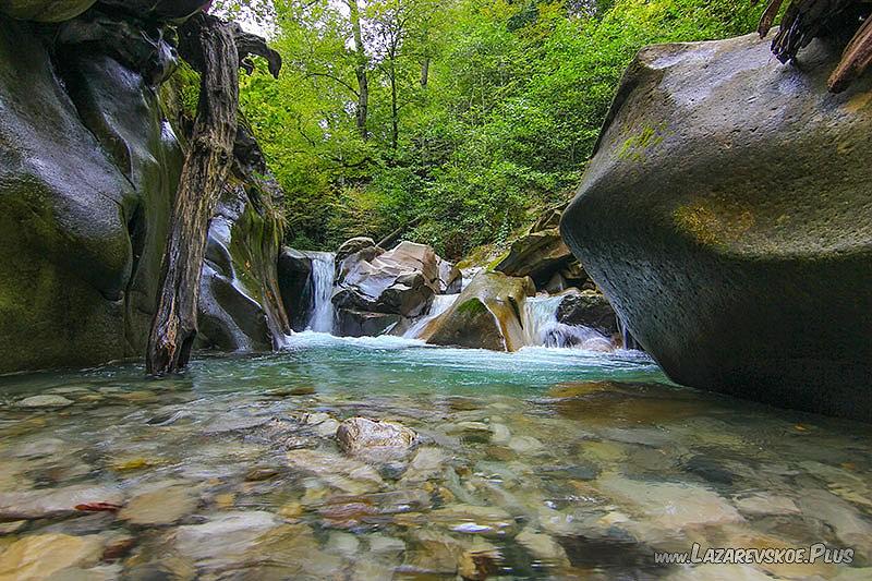 Для продолжения прогулки по ущелью нужно вернуться вниз к речке Куапсе и продолжить путь по дорожке, которая выведет к следующей достопримечательности — водопаду Слёзы деда Мамеда.