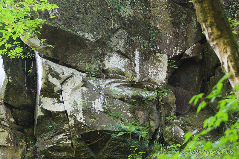 На скале можно заметить изображения созданное природой и напоминающее лицо с усами.