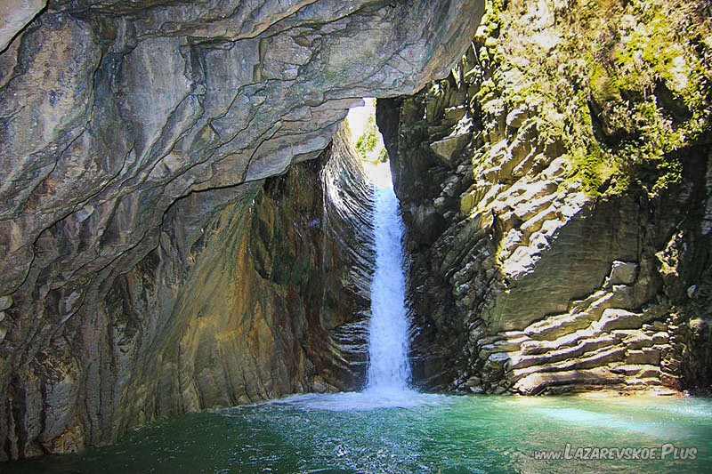 Над купелью нависают мрачные, скалы, среди которых водопад прорезал себе путь.