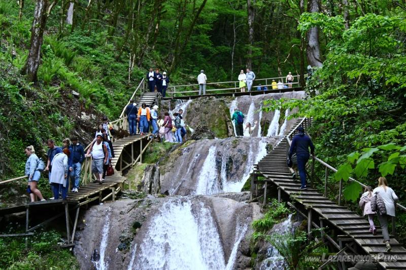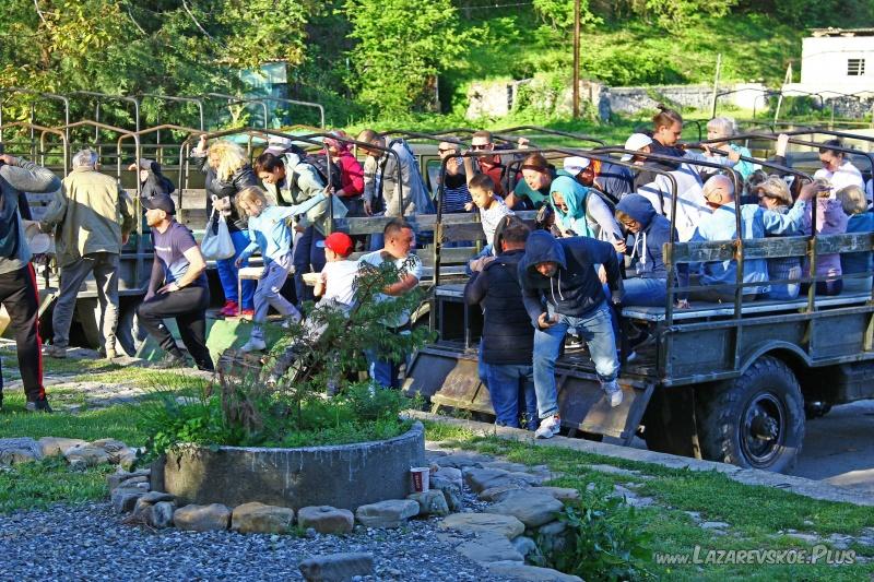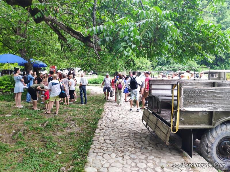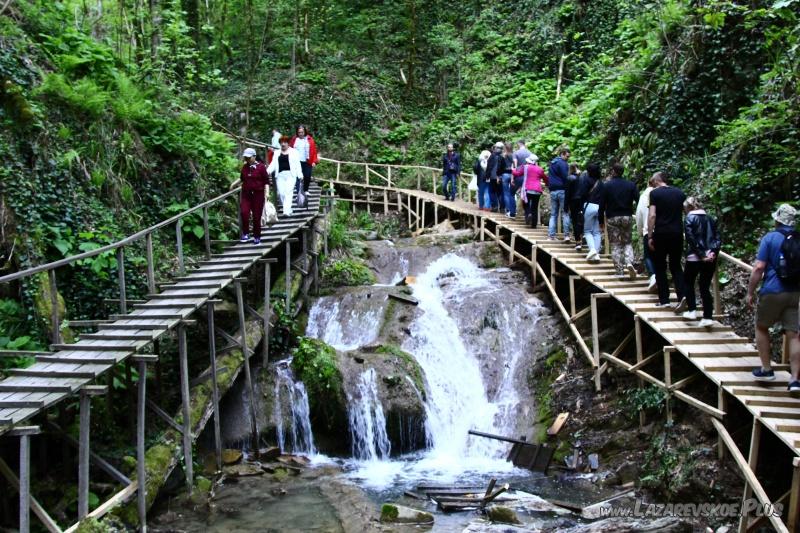 Экскурсия на 33 водопада начавшись из Лазаревского проходит по длинному горному серпантину между морем о горами и прибывает в аул Большой Кичмай, где группа пересаживается на большие машины ГАЗ-66 по реке едет к урочищу 33 водопада, где экскурсанты смогут ознакомиться с этой замечательной достопримечательностью, а также искупаться в многочисленных купелях.