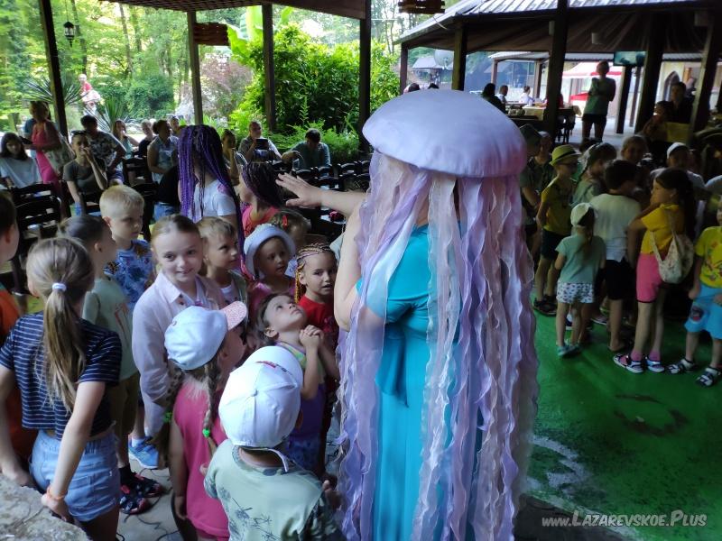 Показав детям водопад и сделав несколько фотографий, отправляемся обратно, где детей ждёт сюрприз - яркое шоу с участием аниматоров в костюмах морских обитателей и пиратов! Представление яркое и весёлое с полным вовлечением детей в игру.